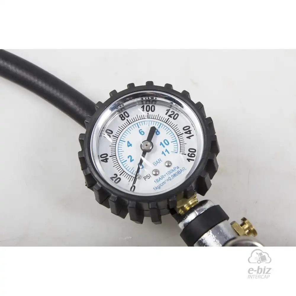 DESCRIPCION 2: La manguera de goma de 550 mm facilita el acceso a todo tipo de motocicletas. Indicador de cuadrante, fácil de leer de 0 a 160 psi o de 0 a 11 bar. Cuerpo de la válvula de fundición a presión con válvula de latón resistente a la corrosión.
